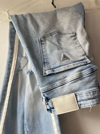 Vaqueros Guess de corte ultra skinny y tiro bajo. - Diseño desgastado con rotos. - Raya lateral blanca. - Detalle de cremallera en los bajos. Vaqueros Jeasn Ultra Skinny Low Jegging Guess Tiro bajo En muy buen estado Talla XS / S Medidas * es elástico pueden ser más sentimeteos Cintura 36Cm Cadera 41Cm Tiro delantero 46Cm Muslo 23Cm Largo Total 95Cm