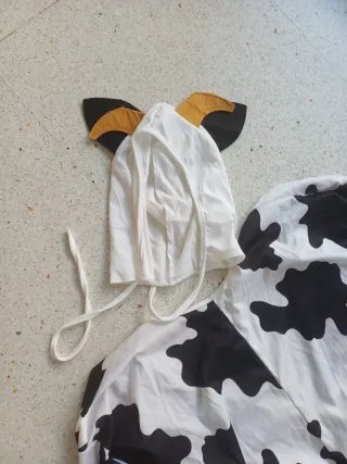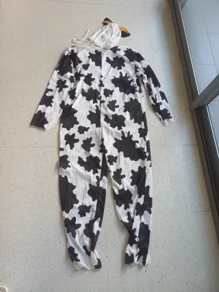 Disfraz divertido con estampado de vaca, ideal para fiestas o carnaval. - Diseño de mono completo. - Incluye capucha con orejas. - Estampado de manchas negras sobre fondo blanco. Talla M / L Dispongo de uno infantil talla 92/104 para ir a conjunto
