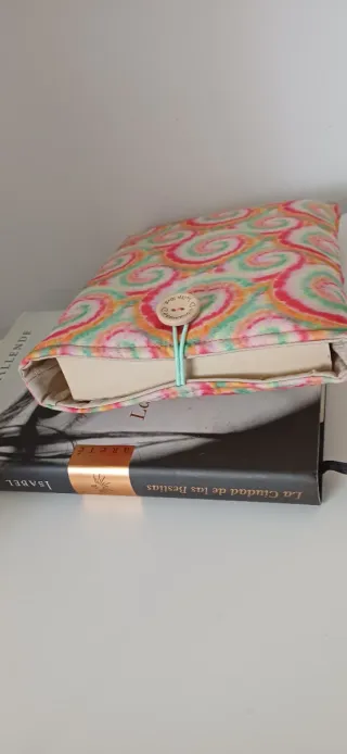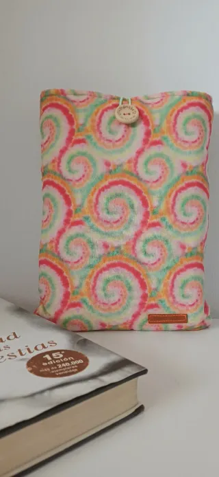 Funda versátil con un diseño "hippie" en tonos suaves. Perfecta para proteger tus libros, agendas o tablets. Por su gran medida caben perfectamente libros de tapa dura. La funda esta confeccionada en telas 100% algodon. La funda esta forrada y lleva un grueso acolchado para proteger tus lecturas. MEDIDAS: 21 cmde ancho. 27 cm de largo. - Cierre con botón de madera. - Detalle de etiqueta cosida. Hecho a mano ❤️.