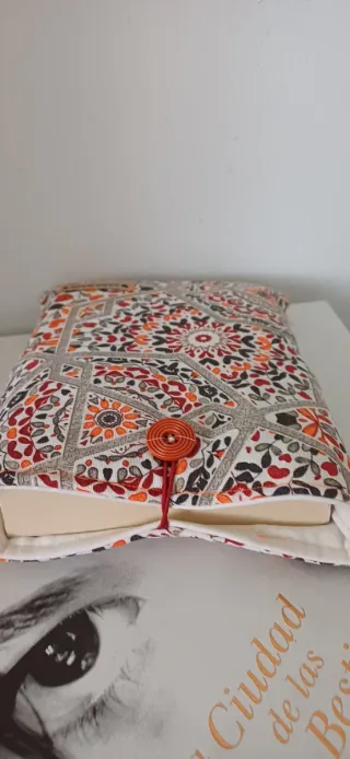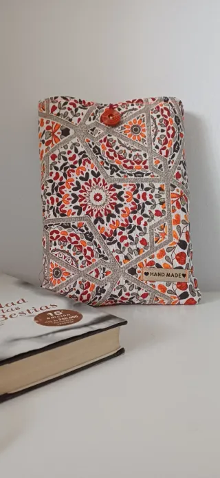 Funda para libros, agendas escolares o de trabajo, tablets... puedes usarla paa llevar documentos. Hecha a mano con un bonito estampado que recuerda " Los Palacios Nazaries ". La funda esta forrada y lleva un grueso acolchado para proteger tus lecturas. Por su gran tamaño caben perfectamente libros de tapa dura. MEDIDAS: 21 cm de ancho ancho27 cm de alto. - Cierre con botón.