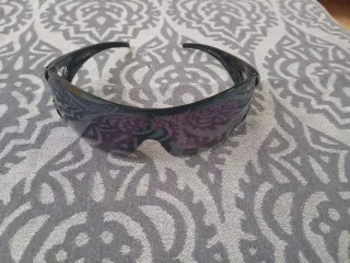 Gafas de sol con un diseño moderno y llamativo. - Montura en color negro. - Lentes con tonalidades moradas y reflejos iridiscentes. - Estilo deportivo y envolvente.