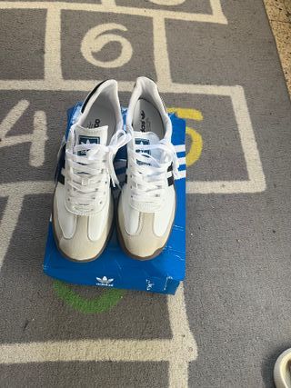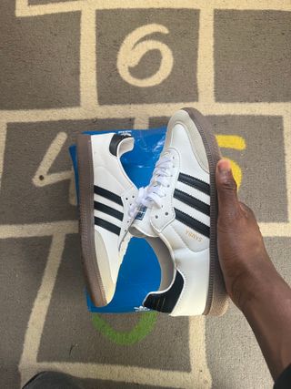 Clásicas zapatillas Adidas Samba en blanco y negro. Un diseño icónico y versátil. - Parte superior de cuero y gamuza. - Tres rayas características de Adidas en negro. - Detalle de talón en negro. - Suela de goma marrón.