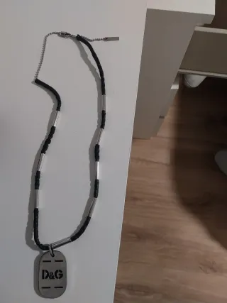 Collar con colgante de la marca D&G. - Diseño con cadena y cordón negro. - Detalle de cuentas plateadas. - Colgante tipo placa con logo D&G.