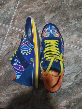 Zapatillas de diseño llamativo con cordones amarillos. - Base azul marino. - Detalles de estampado multicolor. - Cordones de color amarillo brillante. - Interior naranja.