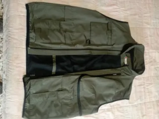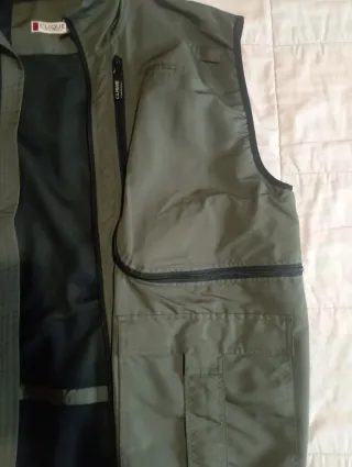 Chaleco de color verde militar, ideal para actividades al aire libre. - Múltiples bolsillos frontales. - Cierre de cremallera. - Diseño sin mangas.