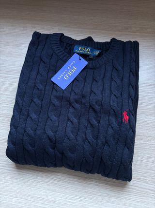 Jersey de punto trenzado de Polo Ralph Lauren. Un clásico atemporal para cualquier guardarropa. - Diseño de punto trenzado 🧶 - Logo del caballo bordado en rojo 🏇 - Nuevo a estrenar 🏷️ - Talla L 📏 Negociable