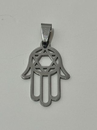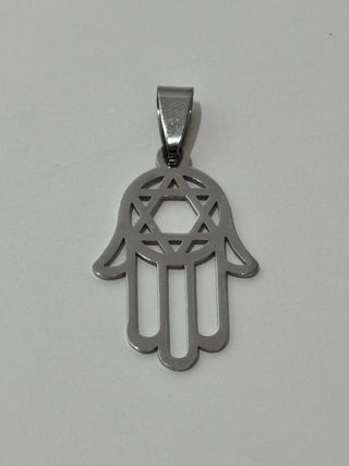 Colgante con diseño de la Mano de Fátima. Aprox 4cm - Fabricado en acero. - Diseño recortado con estrella de David en el centro.
