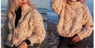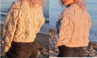 Jersey de punto hecho a mano con un diseño texturizado y detalles de rombos. - Tejido grueso y cálido. - Cuello alto. - Cierre de botones. Jersey artesanal hecho a mano reversible o doble cara Talla XS/S Jersey artesanal hecho a mano pieza única 🧶 composición 10% Lana 80%acrílico 10%poliamida Medida *medidas sin estirar Largo total 54Cm Axila a axila 58Cm Cintura 48 Cm En las últimas fotos hay más jerseys artesanales que podrás encontrar en mi perfil #handmade #hechoamano #jersey #sweater