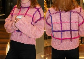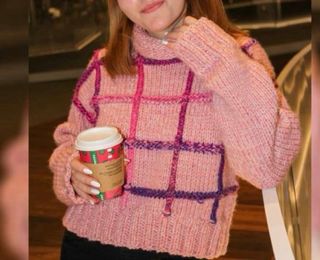Jersey artesanal de punto con un diseño a cuadros en contraste. Es una prenda única y hecha a mano. - Diseño a cuadros en rosa y morado. - Cuello alto. - Manga larga. Talla S/ M Composición 🧶 40%Lana 60%acrílico Medidas * sin estirar Largo total 59Cm Axila a axila 65Cm Cintura 64Cm