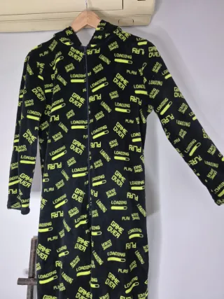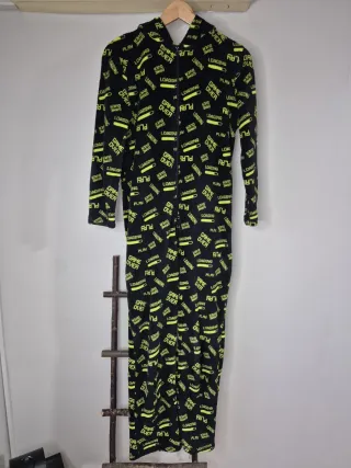 Medidas: - Hombro a hombro: 42cm. - Largo total: 141cm. Conjunto tipo pijama o mono de color negro con estampado en amarillo. Tejido suave y cómodo, ideal para estar por casa, dormir o incluso como look relajado y divertido. Por el corte y el estilo puede funcionar como pijama de mujer oversize o como prenda infantil/juvenil (recomiendo guiarse por las medidas). Una prenda diferente, cómoda y poco común. Estado: Muy buen estado. #pijama #homewear #ropacasa #conjuntocomodo #original #pajamas #loungewear #comfyoutfit #relaxedstyle #uniqueclothing