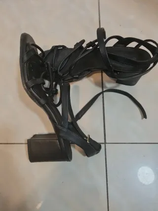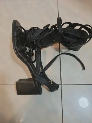 Sandalias de tiras negras con tacón. Perfectas para complementar cualquier atuendo. - Diseño de tiras. - Tacón cuadrado.