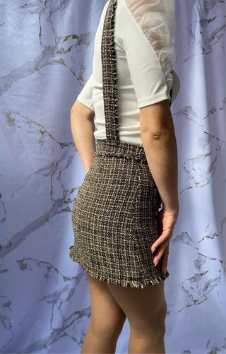 Vestido pichi corto de tweed con un diseño inspirado en el estilo Chanel. Presenta un acabado con flecos en el bajo y en los bolsillos. - Tejido tweed - Diseño pichi - Flecos decorativos Vestido estilo pichi Estilo: Elegante, old money, ideal para looks de otoño/invierno con jerséis de cuello alto o blusas románticas. ‹ muy buen estado Jiffunny&Do *aceptó ofertas Envio 12/24h (Color/ crema/ negro O detalles: Asas ajustable de dos niveles Cremallera de cierre en la espalda Talla S/36eur Medidas Cintura 34Cm Largo total 38Cm