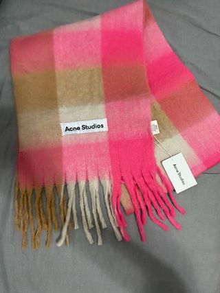 Bufanda de Acne Studios en rosa, beige y marrón con diseño de cuadros. Tejido suave, muy cálida y cómoda. Bufanda unisex, estilo minimalista y moderno. Estado muy bueno, sin roturas ni manchas. Logo Acne Studios visible. Ideal para outfits streetwear, minimalistas o elegantes. Características: • Marca: Acne Studios • Colores: marron, beige, rosa • Unisex Palabras clave: bufanda Acne Studios, bufanda lana, bufanda gris, streetwear Entrega en mano o envío por Wallapop.
