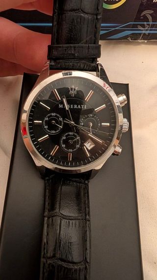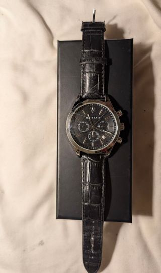 Reloj Maserati Competizione original para hombre, funcionando perfectamente y con pila recién cambiada. • Caja de acero inoxidable • Esfera negra elegante • Cronógrafo con subesferas • Calendario integrado • Resistente al agua 10 ATM • Correa de cuero negra (20 mm)