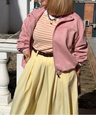 Conjunto de chaqueta rosa,sudadera de rayas y pantalón ancho amarillo. (SE VENDE POR SEPARADO) - Chaqueta con cremallera.(28€) - Sudadera rayas manga larga.(17€) - Pantalón de talle alto con pinzas.(21€) -Collar.(15€) -Pulsera.(10€) -Anillo.(8€)