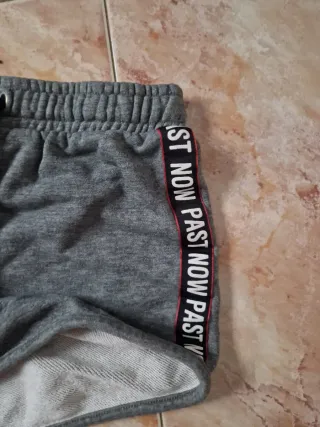 Pantalones cortos deportivos grises con detalle de texto en los laterales. - Cintura elástica con cordón. - Tejido suave y cómodo. - Diseño moderno con texto repetido en las bandas laterales.