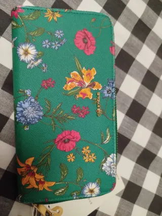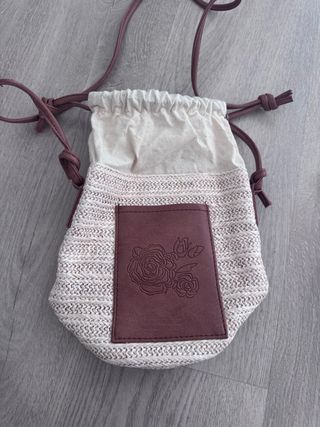 Conjunto de Bolso de mano con un diseño tejido y detalles en piel. - Material exterior tejido. - Detalle frontal con grabado de flores. - Cierre de cordón ajustable. - Correa para llevar al hombro.