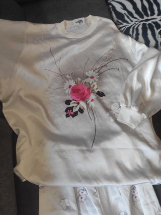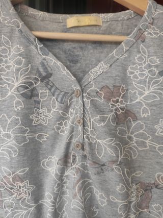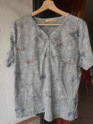 Camisola manga corta mujer. Gris estampado lazos. Perfecto estado. Talla L -XL. Medidas en fotos. Algodón y poliéster Envío por app o por privado nacional previo pago del coste por PayPal o bizum (3'10)