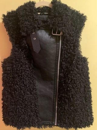 Chaleco de pelo sintético negro con detalles en polipiel. - Diseño de doble faz. - Cierre de cremallera asimétrica. - Detalle de hebilla. - Dos ojales en solapa.