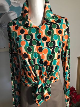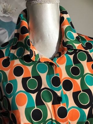 Camisa de punto frío con un llamativo estampado geométrico. - Diseño de cuello camisero. - Cierre de botones. - Manga larga. - Estampado multicolor con círculos y formas curvas.