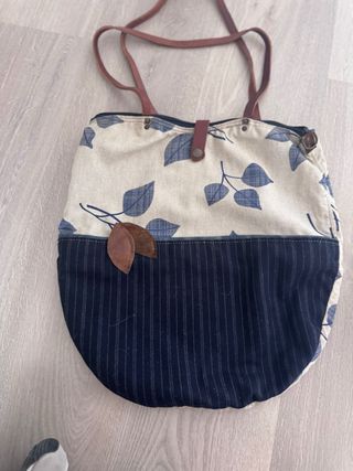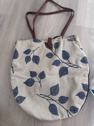 Bolso de tela con un bonito estampado de hojas en tonos beige y azul. Tiene un diseño original y práctico. - Material: Tela. - Diseño: Estampado de hojas. - Cierre: Correa con botón. - Asas: De cuero.
