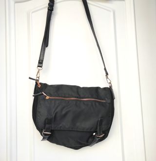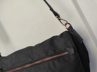 Bolso bandolera de nylon en color negro. Tiene varios compartimentos, cada uno con cierre de cremallera y bolsillos interiores. Las asas son regulables. Es muy cómodo para llevar a diario. Es de Misako.