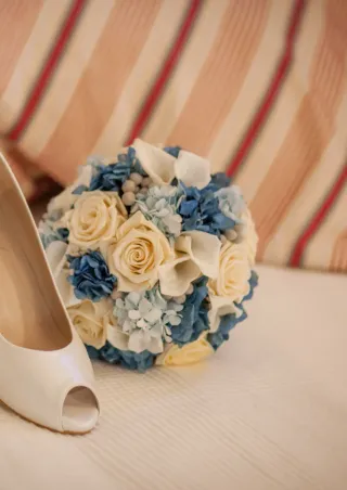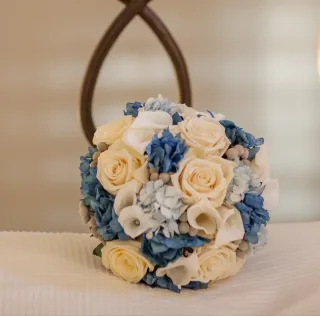 Elegante ramo de novia con una combinación de flores en tonos beige y azul. Perfecto para complementar tu atuendo nupcial. - Flores de alta calidad. - Diseño floral único. - De la tienda La Ponsentia - Flores artificiales con tacto real, realizadas por tienda profesional