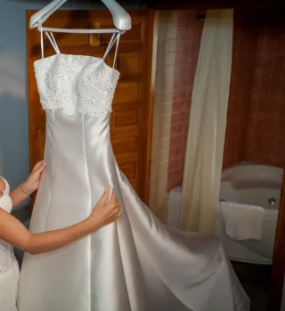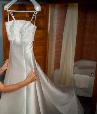 Vestido de novia de la colección Vertize Gala. Un diseño elegante y sofisticado. - Cuerpo con pedrería y escote corazón. - Falda de satén con caída. - Tirantes finos.