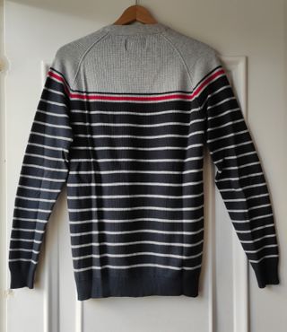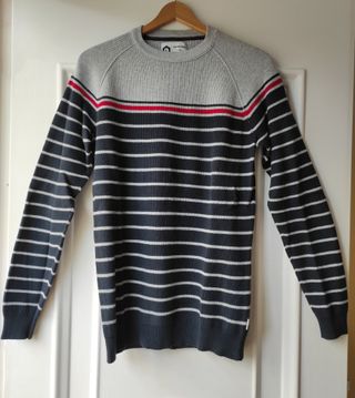 Jersey en color gris con rayas en azul oscuro y rojo. Marca Jack Jones. Talla M. Está en perfecto estado.