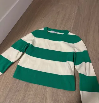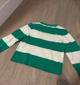 Camiseta de manga larga con un diseño de rayas verdes y blancas. - Cuello redondo. - Tejido de punto suave.