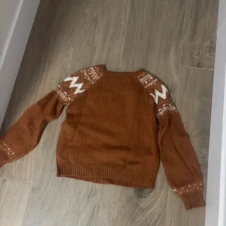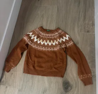 Jersey de punto con diseño de inspiración navideña. - Estampado de grecas en blanco y marrón. - Detalles dorados en la zona del cuello. - Puños y bajo acanalados.