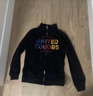 Chaqueta azul marino de Benetton con cremallera frontal y cuello alto. Presenta el icónico logo de la marca en la parte delantera con un diseño multicolor brillante. Talla 12 años - Logo de Benetton con acabado brillante. - Cremallera completa. - Cuello alto.