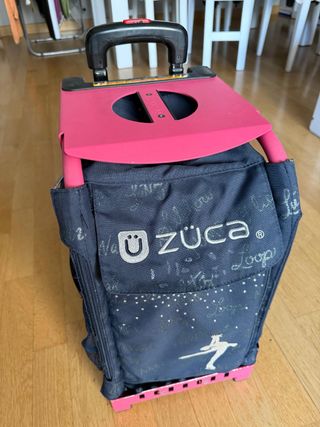 Maleta Zuca con diseño para patines. Ideal para transportar tu equipo. - Estructura en color rosa. - Bolsa principal en color azul marino. - Ruedas con luces Tiene desgaste en los bolsillos laterales de rejilla con algún agujerillo