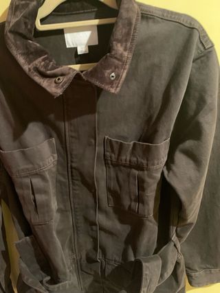 Chaqueta de corte moderno con cuello de pana. - Cierre de botones a presión. - Dos bolsillos frontales con solapa. - Cinturón a juego para anudar. - Detalle de costuras en la parte delantera.
