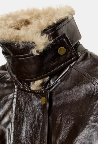 Chaqueta de la colección ZW de Zara con un elegante cuello efecto pelo. - Color marrón. - Cierre de cremallera y botones. - Bolsillos frontales.