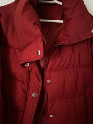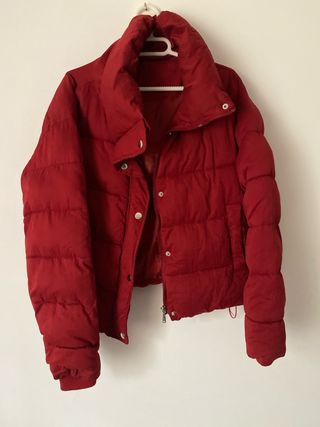 Abrigo acolchado de color rojo. - Cuello alto. - Cierre de cremallera y botones. - Puños elásticos.