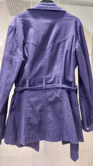 Chaqueta estilo gabardina con cinturón. - Cierre de doble botonadura. - Cuello solapa. - Puños ajustables con botón. - Cinturón con hebilla. Talla 44 aunque da poca talla es más bien una 42