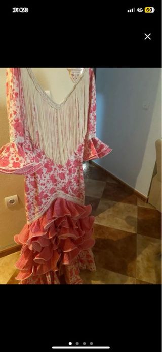 Vestido de flamenca con un diseño vibrante y detalles llamativos. - Mangas largas con volantes. - Falda con múltiples volantes. - Adornos florales en los volantes de mangas y falda.