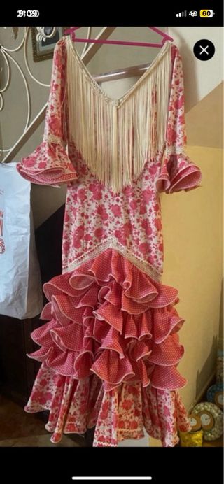 Vestido de flamenca con un diseño alegre y volantes. - Estampado floral. - Adornado con flecos en el escote. - Mangas acampanadas. - Múltiples volantes en la falda.