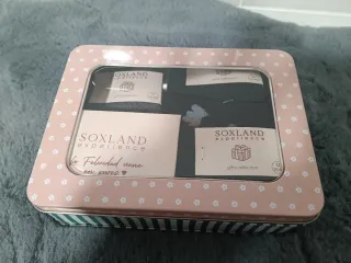 Caja metálica con diseño de flores rosas y blancas, ideal para guardar calcetines. - Incluye tres pares de calcetines. - Diseño de la marca SOXLAND. - Mensaje en español: La Felicidad viene en pares. Talla equivale del 35 al 40