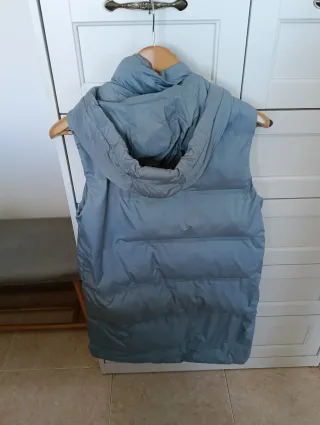 Chaleco largo acolchado con capucha. - Cierre de cremallera. - Cordones ajustables en la capucha. - Bolsillos laterales con botón.
