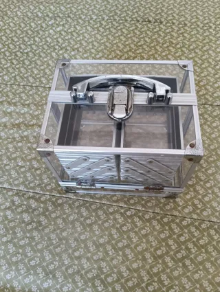 Maletín de maquillaje con acabado plateado y estructura transparente. Ideal para organizar tus productos de belleza. - Diseño moderno y funcional. - Compartimentos interiores para una mejor organización. - Asa superior para facilitar el transporte. - Cierre de seguridad Medidas cerrado 20 x 15cm