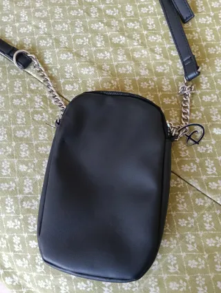 Bolso pequeño con diseño de Minnie Mouse, ideal para llevar el móvil. - Decorado con pedrería plateada. - Detalle de lazo rojo. - Cadena plateada. - Correa negra ajustable.