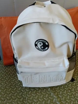 Mochila de polipiel con un diseño moderno y práctico. - Compartimento principal espacioso. - Bolsillo frontal con cremallera. - Bolsillos laterales de malla. - Detalle de logo circular con símbolo Yin Yang y texto TEAM CLOVER. - Inscripción TENTH en relieve en la parte inferior.
