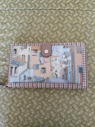 Monedero grande con un diseño artístico de calle. - Cierre de botón a presión. - Estampado detallado de edificios y ropa tendida. - Borde a cuadros. - Correa de mano. Medidas 24x14cm