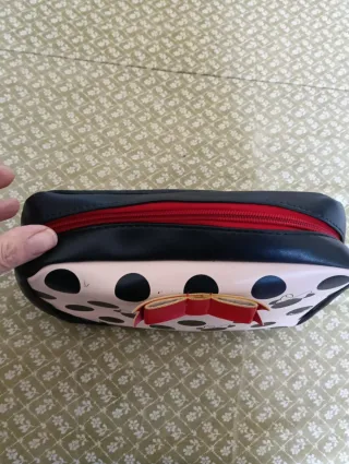 Práctico neceser con un divertido diseño de lunares y el personaje de Minnie Mouse. - Estampado de lunares negros sobre fondo rosa. - Detalle de lazo rojo. - Borde exterior en color negro. Medidas 23x17cm