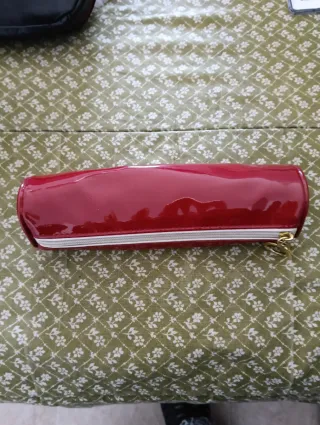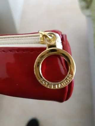 Neceser redondo de la marca Estee Lauder. - Color rojo brillante. - Detalle de cremallera dorada. - Colgante circular dorado con el logo de la marca.