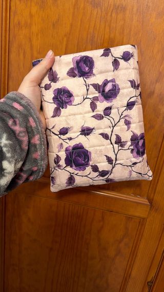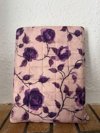 Funda tipo sobre con un bonito estampado floral. - Diseño acolchado. - Rosas moradas sobre fondo beige.