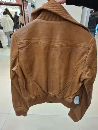 Cazadora de cuero en tono marrón. Un clásico que nunca pasa de moda. - Cuello de canalé. - Puños y cintura elásticos. - Diseño tipo bomber.