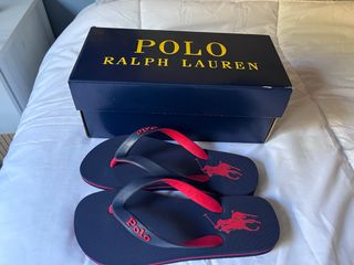 Chanclas originales de Polo Ralph Lauren, talla 37. Vienen con su caja original. - Diseño en negro con detalles en rojo. - Logo del jinete y caballo de Polo Ralph Lauren en la suela. - Tira de goma en rojo.